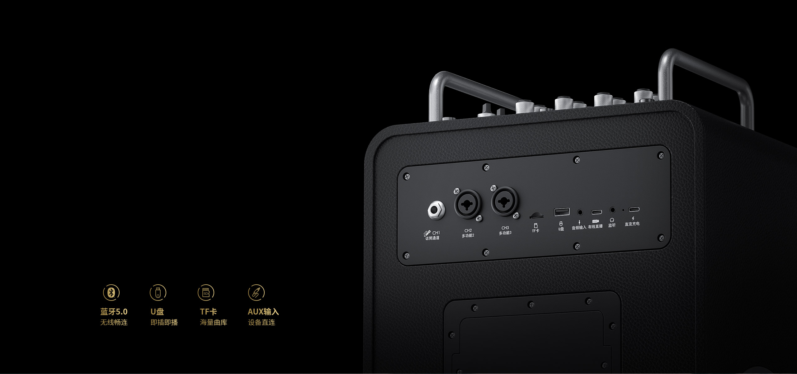 播放功能:蓝牙播放、U盘播放、AUX-in输入、Micro SD卡